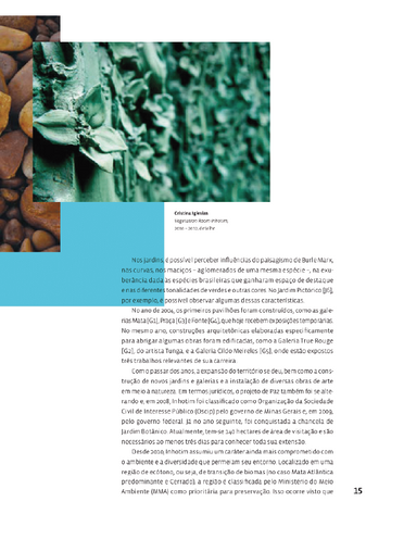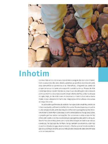 Esta publicação é um registro da prática da equipe do Educativo - sempre em articulação com todas as outros setores do Instituto - ao vivenciar coletiva e transversalmente o lugar “Inhotim” junto com os visitantes, especialmente a comunidade escolar. Os trajetos aqui sugeridos, as atividades práticas propostas e os conceitos abordados devem ser tomados apenas como um primeiro exercício de exploração das diversas camadas de conhecimento presentes no Inhotim. O Educativo, pela primeira vez, apresenta as informações sobre os acervos não mais segmentadas, mas articuladas em possíveis trajetos que podem e deveriam sempre ser reinventados e reorganizados. Indicações sobre plantas, obras, jardins, artistas e histórias se intercalam durante a leitura, revelando um Inhotim integrado, comum, intenso.